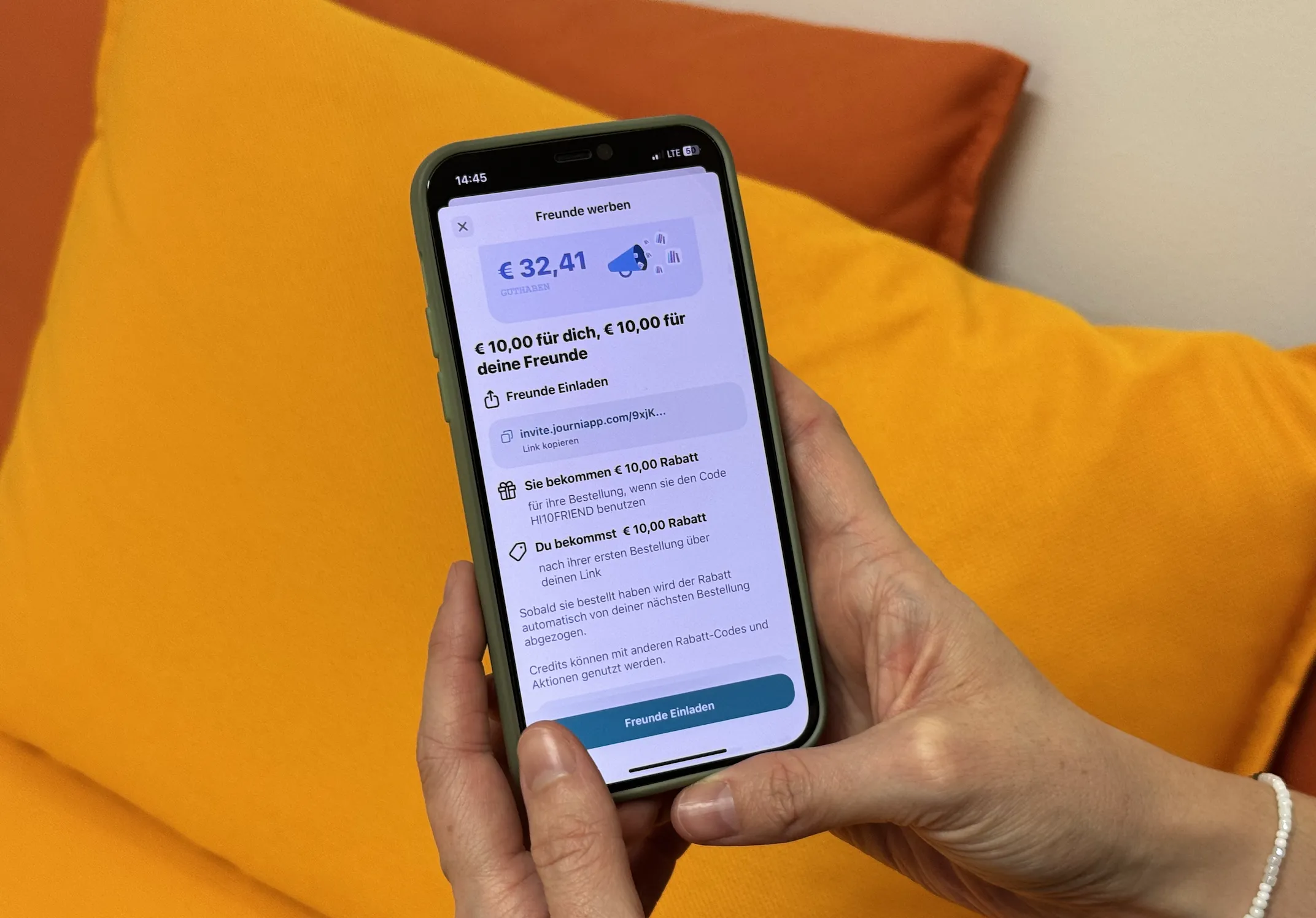„Freunde einladen & sparen“ – dieser Button in der App ist das Geheimnis für Rabatte auf deine aktuellen und zukünftigen Bestellungen. Ein einfaches Dankeschön dafür, dass du die Freude an Journi teilst.